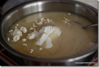 - When you see white colour bubbles on the sides of the pan switch off the flame and transfer it to a greased plate or bowl.